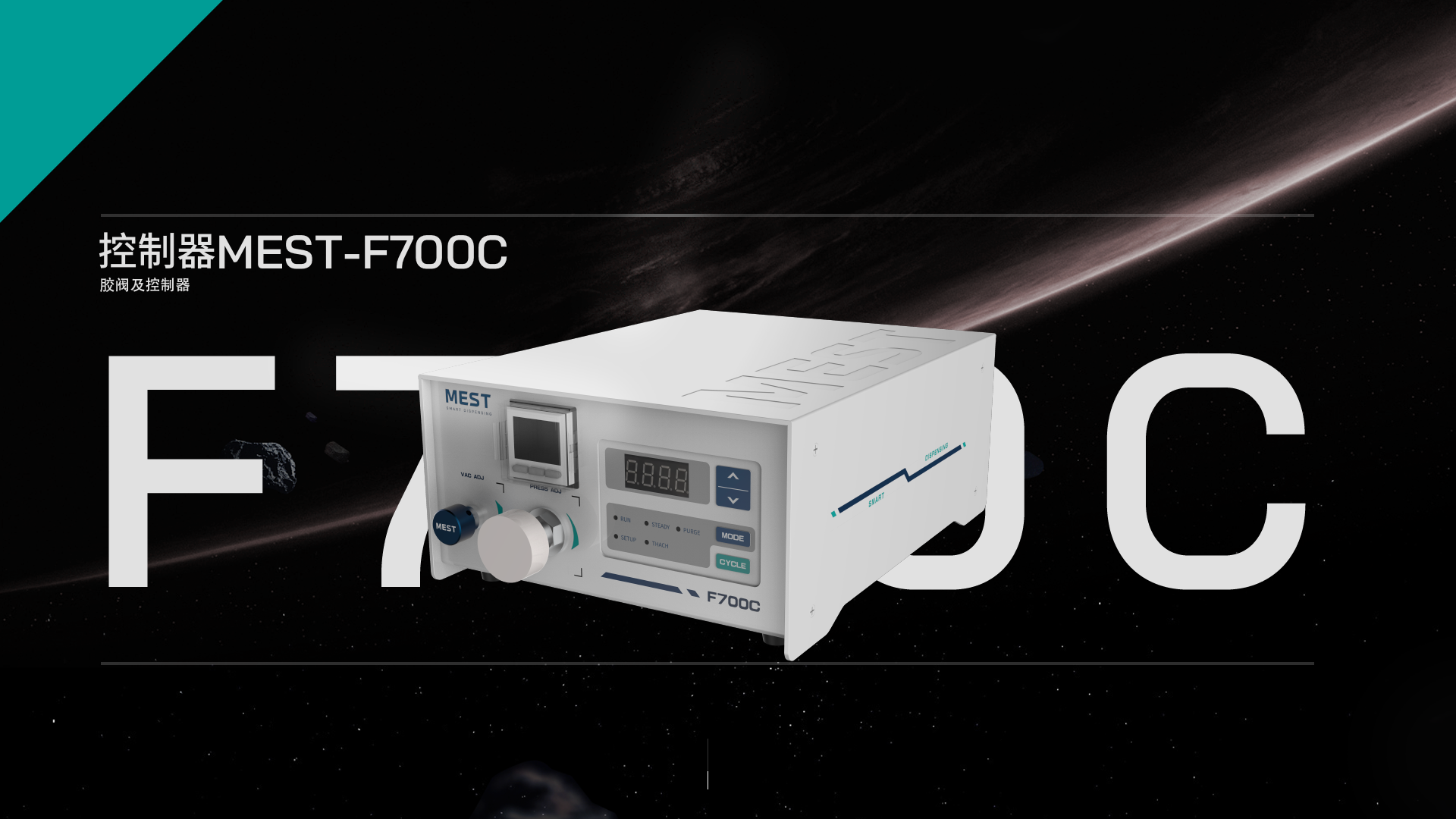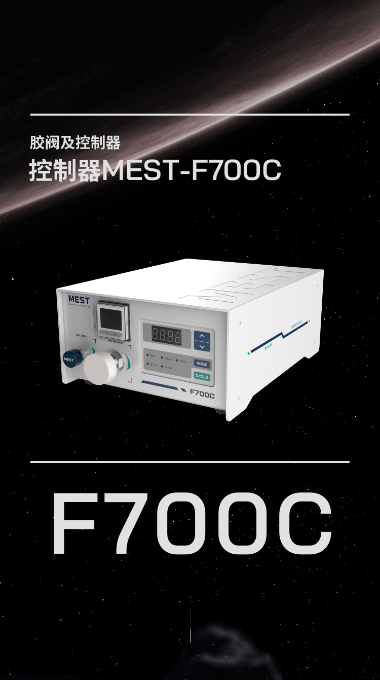 MEST-F700C 高速點(diǎn)膠控制器可控制膠筒進(jìn)行點(diǎn)膠,具備真空回吸功能,輸入氣壓 0.1-0.8Mpa,氣壓精度可達(dá) 0.001Mpa,點(diǎn)膠設(shè)時(shí)范圍 1.0-9999ms。